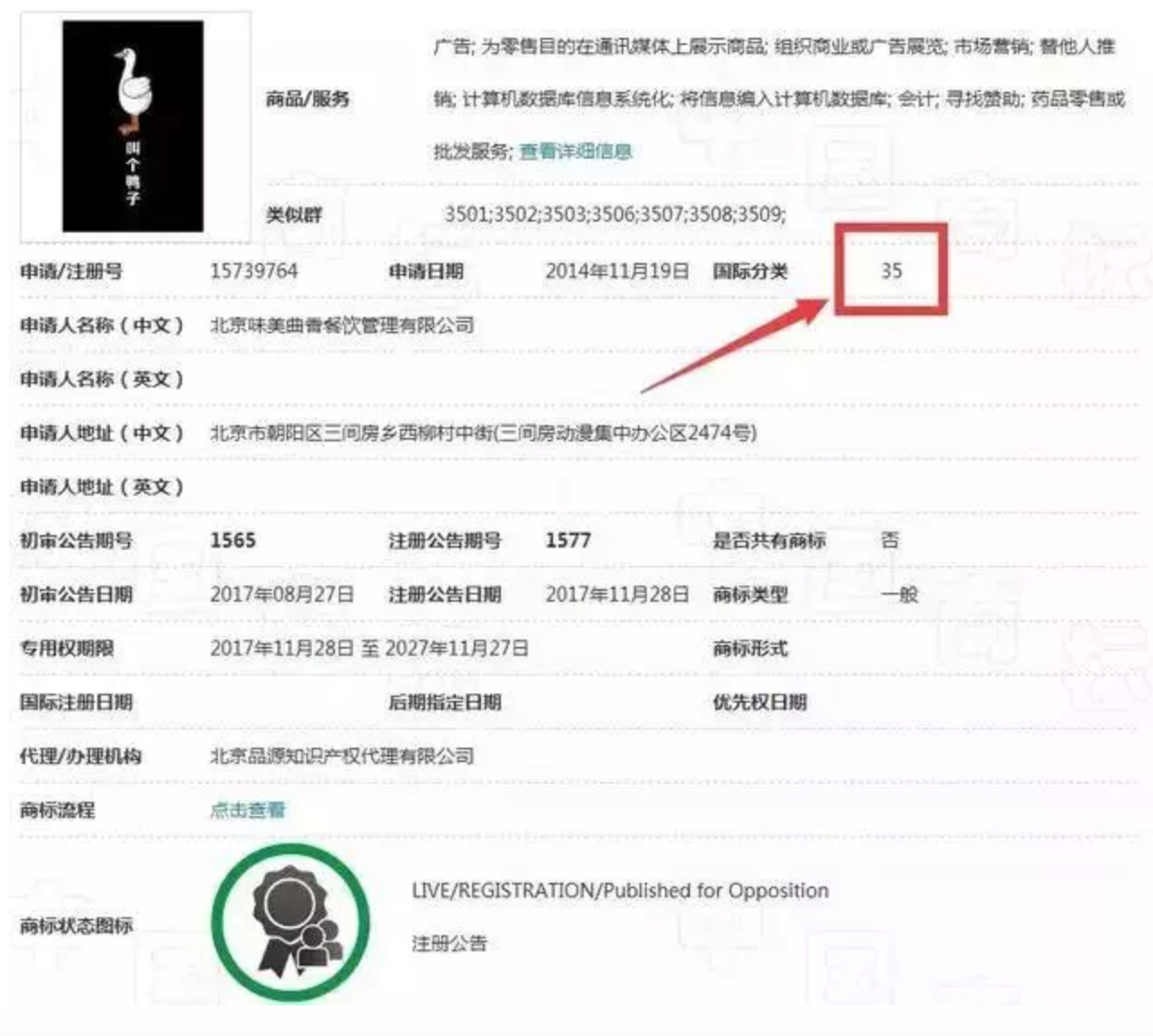 “叫个鸭子”是北京味美曲香公司控股的中餐连锁品牌。2014年11月,味美曲香公司向商标局提出商标注册申请,将“叫个鸭子”注册为第45、44、43等数十类服务商标。但大部分因为违背社会良好风气而被商标局和商标评审委员会驳回,其北京知识产权法院也认为公众在字面意义上会产生不当的联想,造成不良的社会风气和影响。