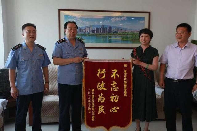 横店集团总裁助理程燕姬、法务总监厉剑飞一行受横店集团创始人、横店“四共委”主席徐文荣委托,将锦旗、感谢信送到金华市场监管局,对帮助夺回被抢注的“横店圆明新园”商标表示感谢。