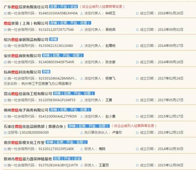 根据全国企业信息网资料,目前全国已有10多家企业名称中包含“鹿晗”,经营范围覆盖到影视演出,化妆品,服装饰品,日用百货,家居用品,食品、饮料、酒、烟、日用百货零售,投资咨询,技术服务,室内外装饰装潢工程,蔬菜种植等领域。其中,2013年9月2日成立的鹿晗贸易(上海)有限公司是诸多企业中最早成立的,而鹿晗投资的南京鹿晗影视文化工作室则成立于2014年10月30日,稍晚于前者成立。