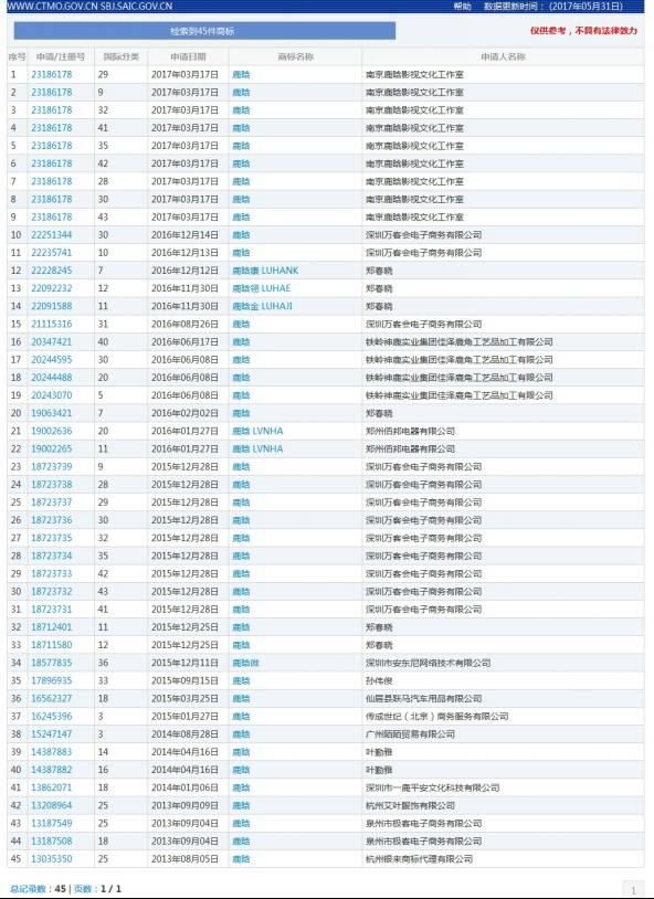 根据商标网2017年5月31日更新数据,目前共有45件“鹿晗”或者包含“鹿晗”的商标申请,已有12件“鹿晗”商标获得注册,12件“鹿晗”商标获得初步审定公告,最早商标申请日为2013年8月5日。
