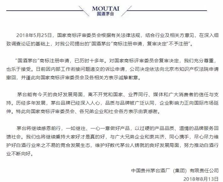 8月13日晚间22时许,茅台集团发表声明,申请撤回“国酒茅台”商标和对商评委(全称为国家商标评审委员会)的起诉,并表示充分尊重并乐于接受商评委的复审决定,还表达了歉意。但仅仅一个月前,茅台不服商评委不予注册的复审结果,非常硬气地一纸诉讼将商评委告上法庭,并将五粮液、郎酒、汾酒、舍得酒业等31家机构和企业列为第三人。此前,茅台已经为申请“国酒茅台”商标奔走17年,向商评委提出申请共计10次。为何突然就服软了呢?