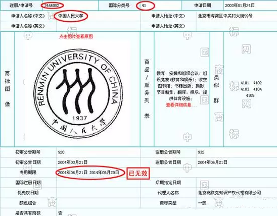 而后网友们查询到,按照商标局目前的查询结果,人民大学上述校徽商标的确已经过了专用期限,也未申请续展,且在6个月的宽限期内也未提出续展申请。
