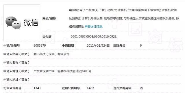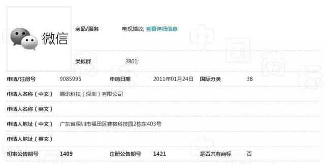 早在2011年1月21日,微信测试版发布,2011年1月24日腾讯向商标局提交了“微信”图文商标注册申请。不过,当时腾讯申请的“微信”商标只有两个类别,计算机相关(9类)和电视相关(38类)。