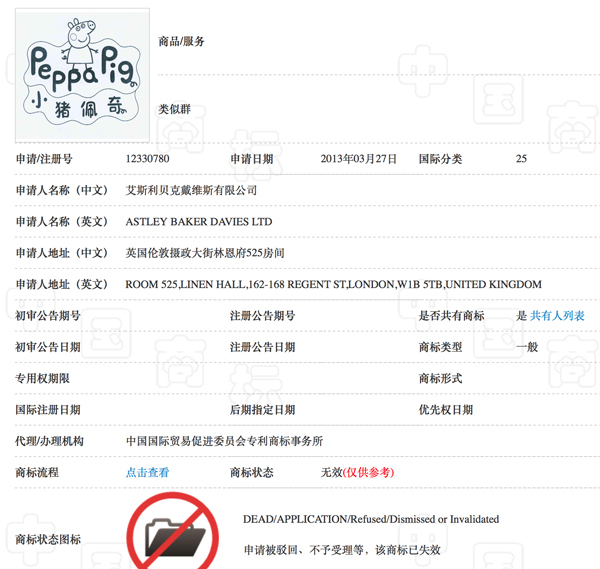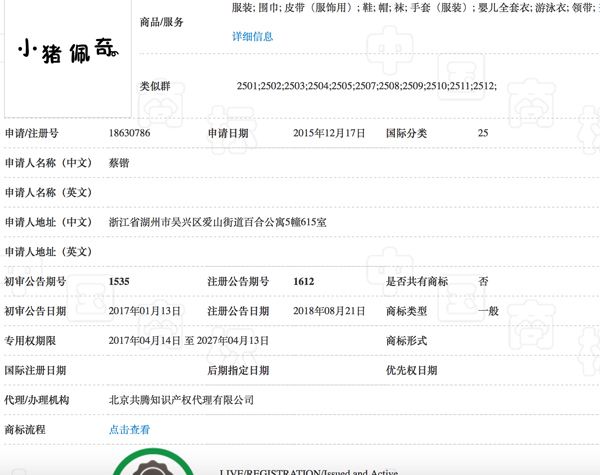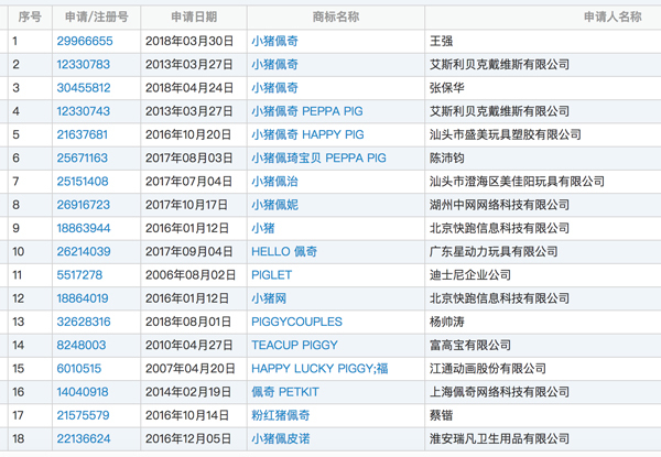 在商标局搜索“小猪佩奇”,可以看到商标申请者诸多