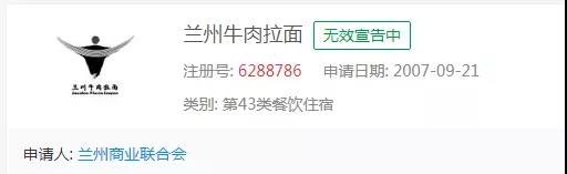 查询到,争议商标为第6288786号“兰州牛肉拉面Lanzhou Niurou Lamian及图”。它是兰州商业联合会在2007年9月21日申请注册,于2010年3月28日获准注册,被核定使用在第43类餐厅等服务上,专用权有效期至2020年3月27日。