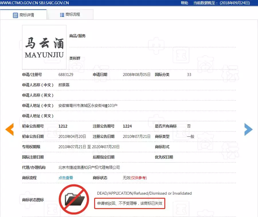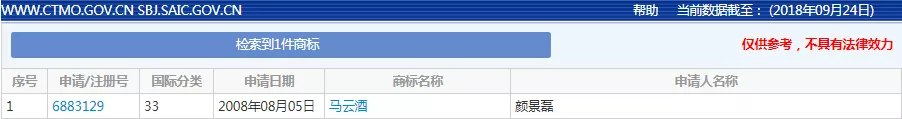 不不不,这个“马云酒”商标与马云爸爸可是没有任何关系哦,不要被骗啦!从国家商标局查到了这枚商标。