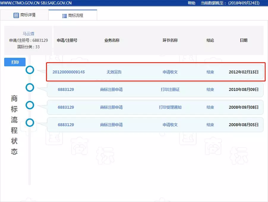 商标流程状态显示该商标于2012年2月15日被宣告无效,虽然从页面上未能看到是由哪一方提出商标异议,但似乎答案显而易见。