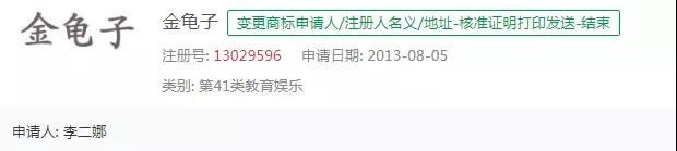 “金龟子”本尊,刘纯燕在2013年12月才成立北京金龟子文化发展有限公司。该公司申注的54件“金龟子”图文商标,最早申注日期为2014年01月26日。这个时间的的确确晚于第13029596号“金龟子”商标申请日期。