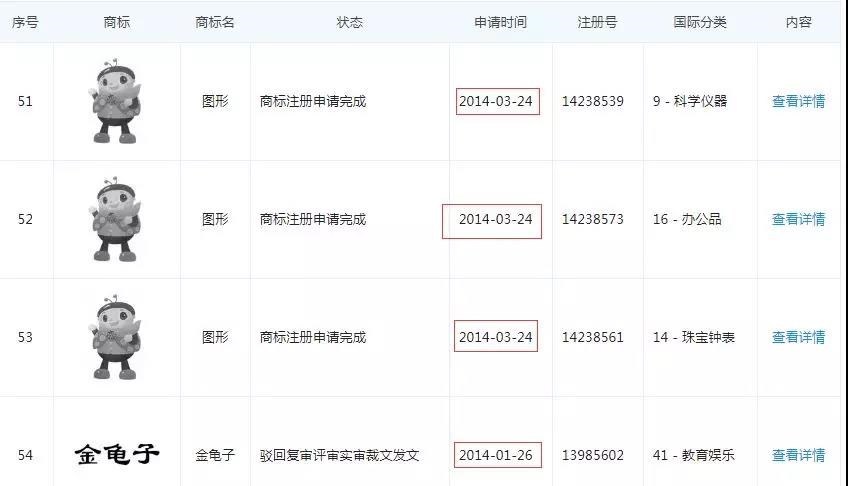 据了解,第13029596号“金龟子”商标是在2013年08月05日申请注册,核定使用在第41类培训、教育、组织舞会、组织教育或娱乐竞赛、组织表演(演出)、图书出版、游乐园、提供娱乐设施、娱乐服务范围内,并在2015年08月14日成功注册。