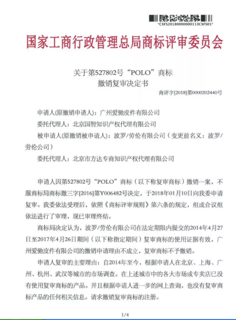 日前,广州爱驰皮件有限公司以连续三年未使用为由,申请撤销拉夫劳伦公司名下的第527802号“POLO”商标纠纷,商标局驳回了广州爱驰皮件有限公司的撤销申请,但商评委作出了一纸撤销决定。