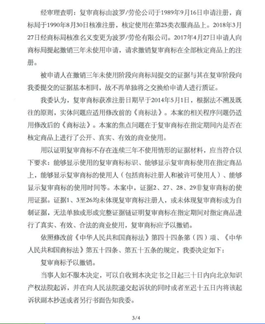 商评委的裁定理由比较简洁,即认为波罗/劳伦有限公司提交的证据或非复审商标的使用证据,或未体现复审商标注册人,或未体现复审商标或为自制证据,无法单独或形成完整证据链证明复审商标在指定期间对指定商品进行了真实、 有效、合法的商业使用,复审商标应予以撤销。