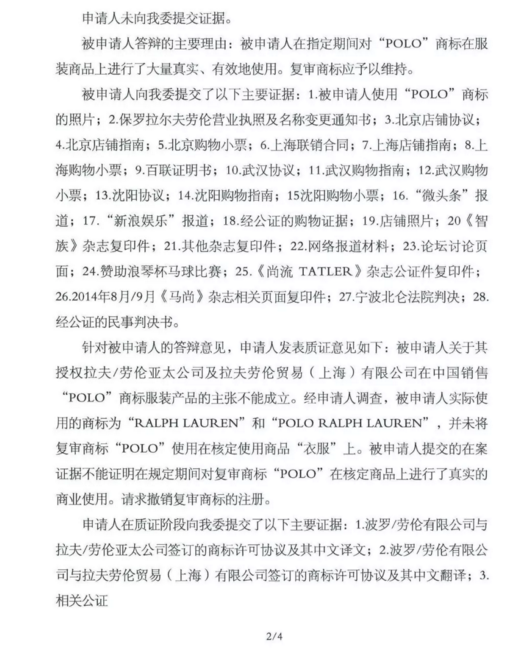 波罗/劳伦有限公司对此辩称,在指定期间对“POLO”商标在服装商品上进行了大量真实、有效地使用。复审商标应予以维持。为了支持这一观点,波罗/劳伦有限公司向商评委提交了包括多地店铺协议、购物小票、媒体报道、法院判决共计29项证据。